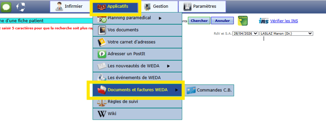 Pour éditer la liste des utilisateurs actifs, se connecter à Weda, puis dans le menu principal, sur "Applicatifs", choisir dans le menu déroulant l'entrée "Documents et factures Weda" :