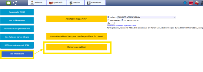 Cliquer ensuite sur le bouton "Vos attestations" puis sur "Membres du cabinet" :