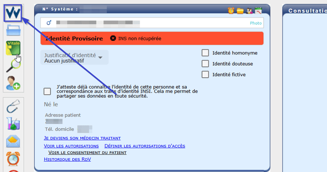 Lorsque vous êtes sur le dossier patient, cliquer sur le menu "W" :