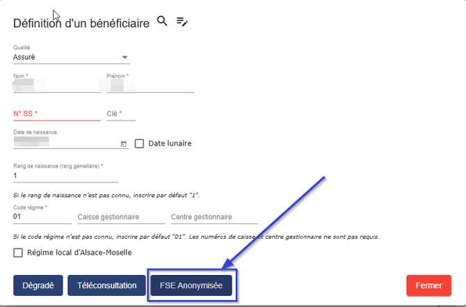Un encadré apparait, remplissez les informations obligatoires (un astérisque indique l'obligation) puis cliquer sur "FSE Anonymisée" :