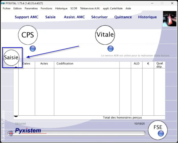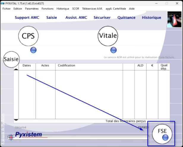 Une fois les actes saisis, vous devez sécuriser la FSE en cliquant sur le rond FSE en bas à droite :