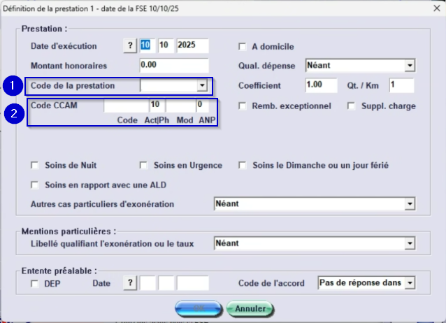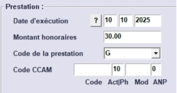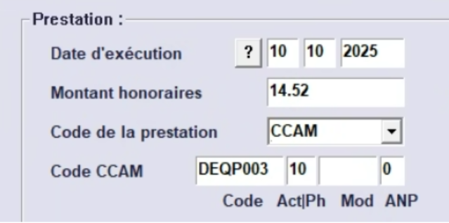 Dans le cas d’un acte NGAP, vous pouvez sélectionner l’acte dans le champ « code de la prestation » ou le saisir en MAJUSCULE