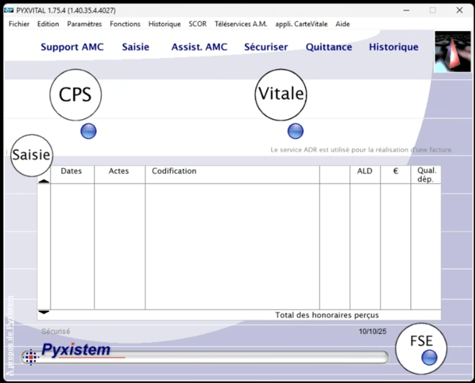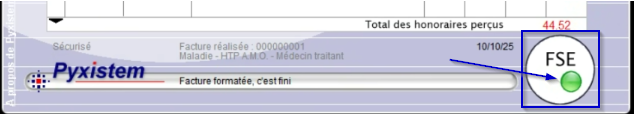 Une fois la FSE sécurisée, vous revenez dans la fenêtre de Pyxvital avec tous les voyants au vert dont celui a côté du rond « FSE » qui signifie que la FSE a bien été créée :