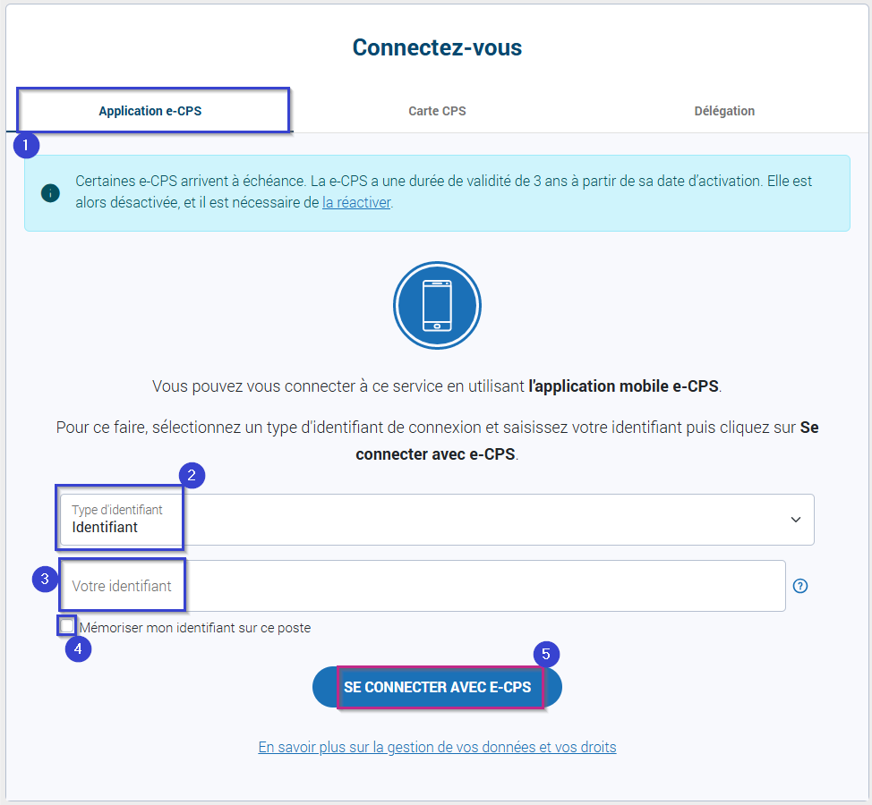 - Renseignez votre code porteur pour vous authentifiez avec votre carte professionnelle (CPS, CPA, CPE, CPF, ...)