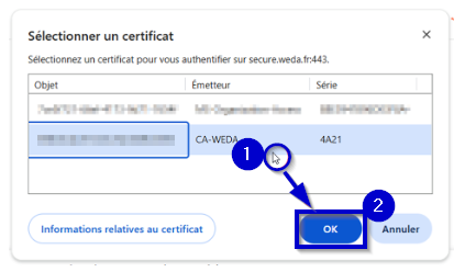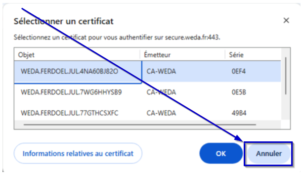 - Rendez vous sur Weda et refusez le certificat de connexion ;