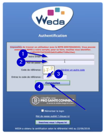 Pour associer votre compte Pro Santé Connect à Weda, renseignez vos identifiant (1) et mot de passe (2) de connexion ainsi que le code de référence (3) et cliquez sur "Connexion" (4) :