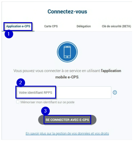 - Renseignez votre code porteur pour vous authentifiez avec votre carte professionnelle (CPS, CPA, CPE, CPF, ...)