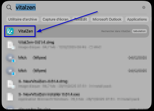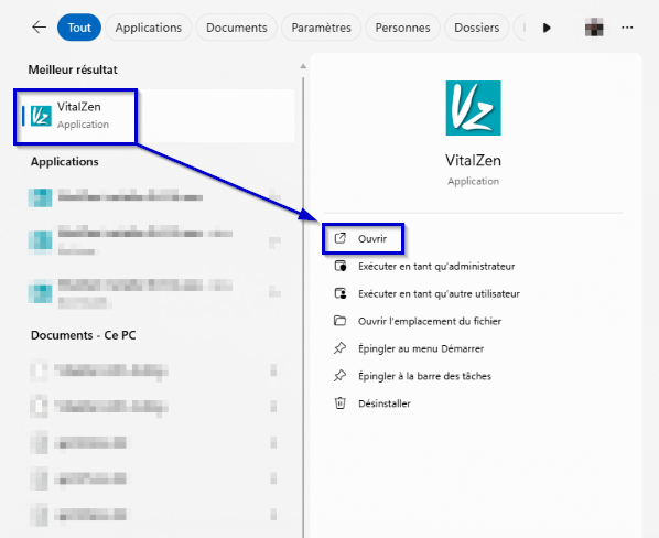 Le résultat de recherche affiche alors "VitalZen" comme premier résultat. Cliquez sur "ouvrir" :