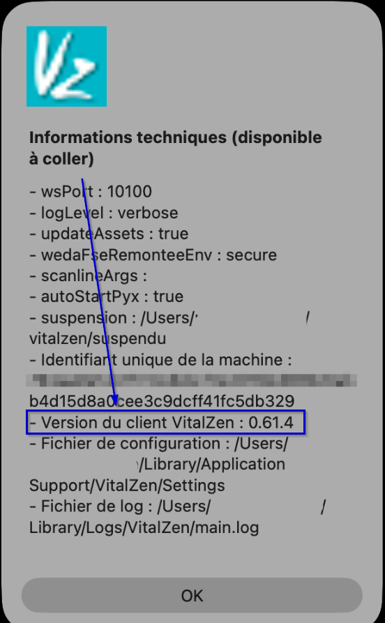Votre "version du client VitalZen" doit être en version 0.61.4 pour être à jour.