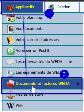 Pour récupérer l’attestation du module Weda Connect, rendez-vous dans l'onglet "Applicatifs", cliquez sur "Documents et factures Weda" :