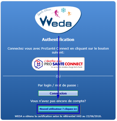 Procédez à votre inscription en suivant ce lien ou en vous rendant sur secure.weda.fr et en cliquant sur "Nouvel utilisateur" :