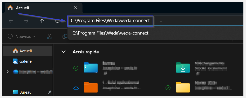 Copiez le chemin suivant : C:\Program Files\Weda\weda-connect et appuyez sur la touche "Entrée" :